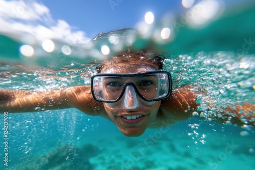 Naklejka premium A cheerful child is snorkeling in tropical waters, wearing oversized goggles and enjoying the vibrant underwater scenery, embodying a spirit of exploration and fun.