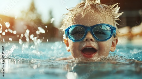 Fototapeta premium A cheerful child, wearing blue goggles, enjoys splashing in the pool, embracing the pure joy and freedom of summer under a glowing sun with excitement all around.