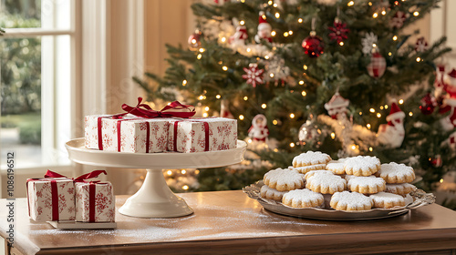© aun, Naklejka premium A cheerful Christmas setting with gift boxes stacked under a tree and a tray of fresh cookies dusted with powdered sugar