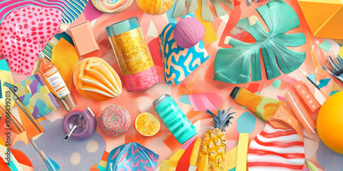 Fototapeta premium A cheerful digital collage of various products on sale, highlighted with bright colors and playful patterns