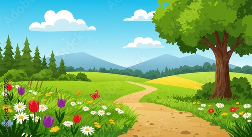 © PP Creative, Fototapeta premium A cheerful flat illustration of a sunny spring meadow with a winding dirt path leading into the distance