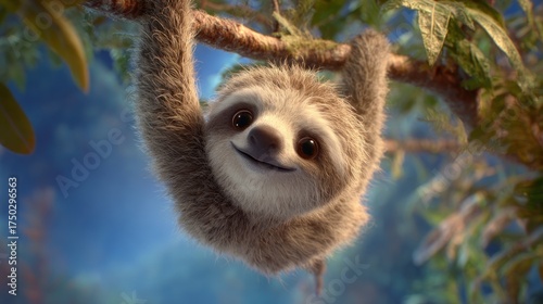 © muhammad, Obraz premium A cheerful, fluffy sloth hangs from a tree branch, smiling sweetly at the viewer