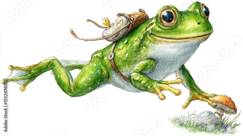 © dee-nesia, Obraz premium A cheerful frog with a backpack leaps through the air, a mushroom nearby.