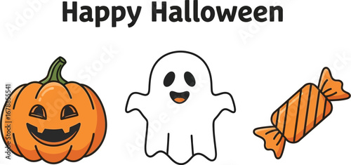 Obraz premium A cheerful halloween illustration featuring a pumpkin, a ghost, and a candy for a festive celebration