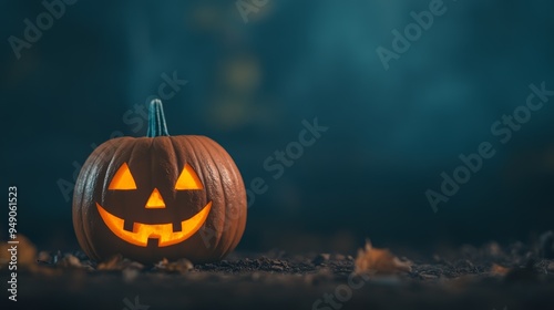 © Pual GotoMars, Naklejka premium A cheerful Halloween pumpkin lantern glows in the dark, surrounded by leaves, creating a magical autumn atmosphere.