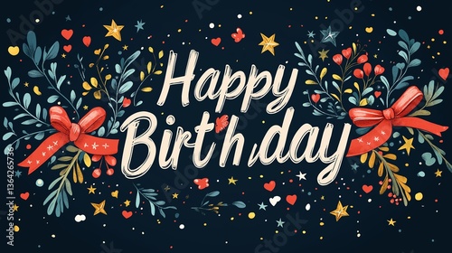 © Arsal Stock, Fototapeta premium A cheerful Happy Birthday message adorned with vibrant floral bouquets and festive red bows, scattered with stars and hearts on a dark background.