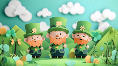 © MakeitEasy, Naklejka premium A cheerful leprechaun in a green hat celebrates St Patrick's Day with shamrocks and a pot of gold, capturing the festive spirit of Ireland