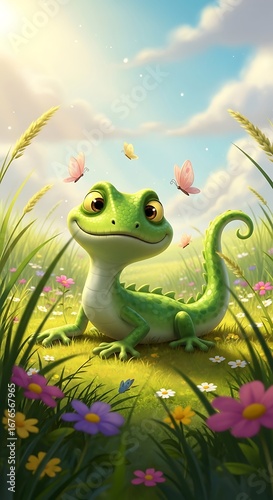 © Nu, Obraz premium A cheerful lizard in a meadow