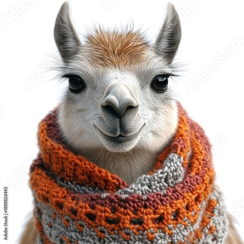 © vimp, Fototapeta premium A cheerful llama dons a vibrant knitted scarf, radiating joy and charm