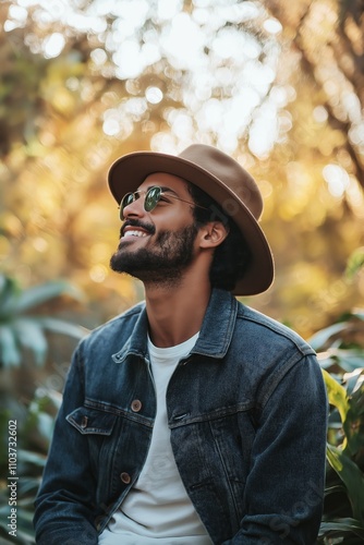 Obraz premium A cheerful man wearing a hat enjoys the beauty of nature. His smile conveys joy and warmth in the scene.