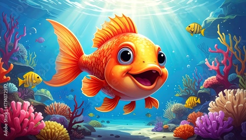 Fototapeta premium A cheerful, orange fish swims amidst a vibrant coral reef, radiating joy and...