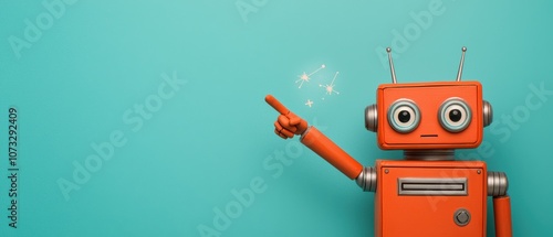 Fototapeta premium A cheerful orange robot points playfully against a vibrant turquoise...