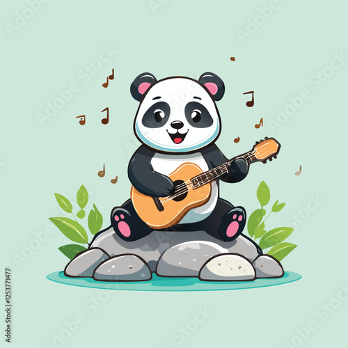 Fototapeta premium A cheerful panda playing an acoustic guitar while sitting on a rock, with musical notes floating around, warm and vibrant vector art