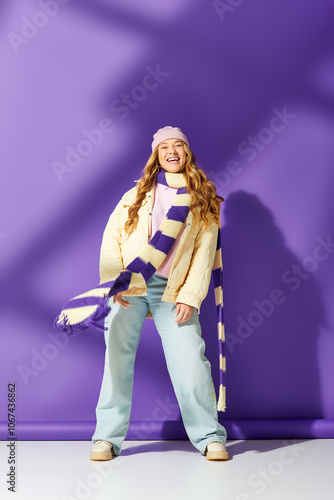 © LIGHTFIELD STUDIOS, Fototapeta premium A cheerful plus size woman stands confidently in colorful clothing, expressing joy and style.