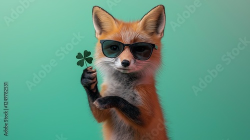 © Natalia S., Obraz premium A cheerful red fox proudly holds a lucky four-leaf clover while wearing stylish sunglasses. The fox’s playful expression and upright posture, Irish St. Patrick day
