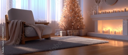 © lililia, Obraz premium A cheerful scene of a living room with a tall Christmas tree adorned with colorful decorations, stockings hung, and a glowing fireplace