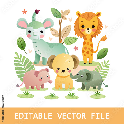 Naklejka premium A cheerful set of African animals painted in watercolor, isolated on a white background. Safari wildlife featuring a lion, hippo, elephant, and giraffe, perfect for decorating baby showers
