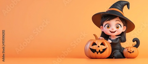 © AKE, Fototapeta premium A cheerful witch with a hat and carved pumpkins ready for Halloween festivities against a vibrant orange background.