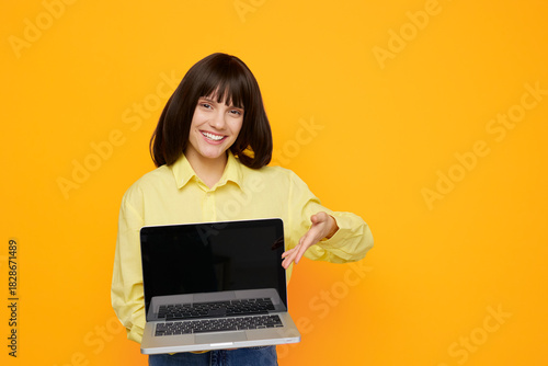 © SHOTPRIME STUDIO, Fototapeta premium A cheerful woman stands against a vivid orange backdrop, proudly presenting a laptop. This image conveys online learning, remote work, and modern technology with approachable energy.