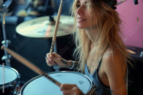 Fototapeta premium A cheerful woman stands outdoors, adorned in an apron and glasses, tending to...