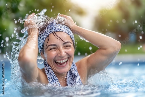 © SerPak, Obraz premium A cheerful 65 year old grandmother splashes joyfully in a bright blue pool on a sunny summer day. Her hands are raised, and droplets of water fly around as sunlight creates a playful atmosphere in her