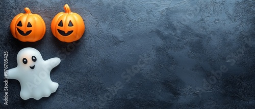 © Hryhor Denys, Fototapeta premium A cheerful yellow ghost poses with two smiling pumpkins on a textured grey surface, capturing the spirit of Halloween in a delightful flat lay arrangement