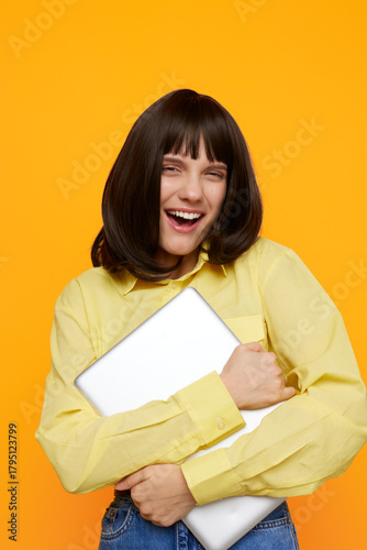 Fototapeta premium A cheerful young woman in a yellow shirt hugs a silver laptop against a bright orange backdrop, conveying enthusiasm, study motivation, and modern technology for creative projects.