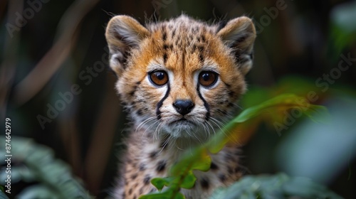 © vixion, Obraz premium A Cheetah Cub Peeking Through the Foliage