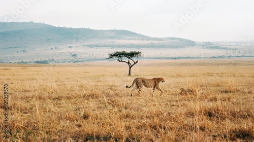 © VK Studio, Naklejka premium A cheetah elegantly prowls an open, golden savanna, with a single acacia tree and misty hills creating a dreamy, expansive backdrop.