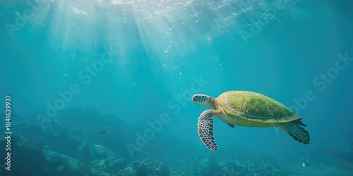 Fototapeta premium A Chelonia mydas swimming near the shoreline, highlighting marine species...
