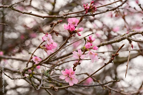 Fototapeta premium a cherry blossomed tree on a clear, gray day