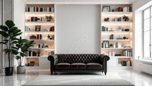 © Tahir, Fototapeta premium A chesterfield sofa in a bright living room with built in bookshelves and a large houseplant in a pot