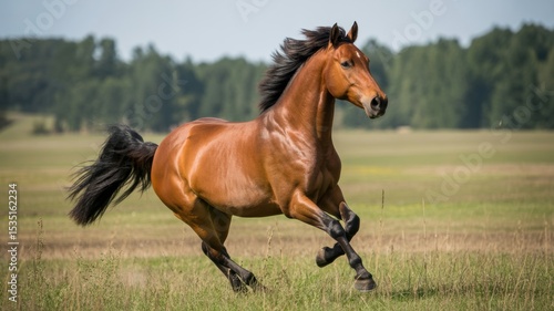 © dang, Fototapeta premium A chestnut horse galloping freely across a grassy field under a clear sky.