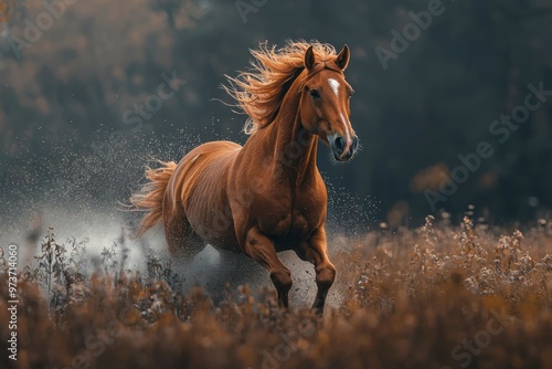 Obraz premium A Chestnut Horse Running Through a Field of Tall Grass