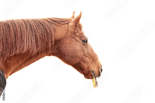 Obraz premium A chestnut horse's head with a cob of corn in his mouth and a white background.