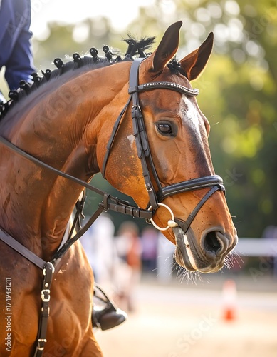 © yuyu, Obraz premium A chestnut horse, saddled and bridled, with a braided mane, is focused on the horizon in soft, natural light. The rider is partially visible