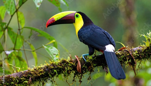 © MAKASIHMAS SIDNEY, Obraz premium A Chestnut-mandibled Toucan perches on a moss-covered branch in a leafy green environment.