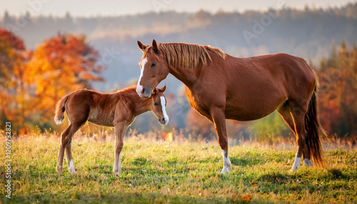 © Arda ALTAY, Fototapeta premium A chestnut mare and her young foal stand in a golden autumn field with colorful fall foliage in the background.