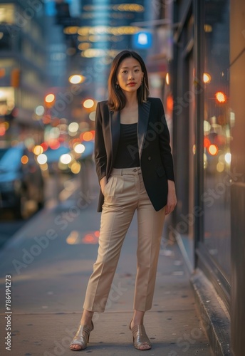 Fototapeta premium A chic city girl portrait with an Asian twist, featuring a tailored blazer, trousers, and heels.