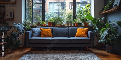 Obraz premium A chic contemporary living room with a stylish sofa, vibrant cushions, and green plants, creating a cozy and inviting space.