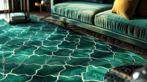 © ibtesam, Obraz premium a chic emerald green area rug adorned with subtle charcoal gray geometric patterns