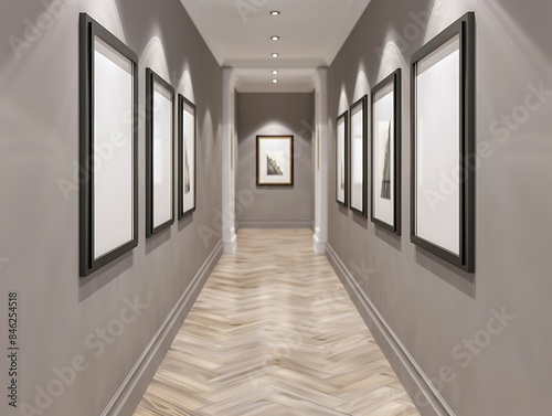© Hasnain Arts, Fototapeta premium A chic hallway with a warm grey wall, showcasing six small empty black frames in a line.