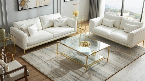 Obraz premium A chic, modern living room with white sofas, geometric decor, glass coffee table, and neutral tones.