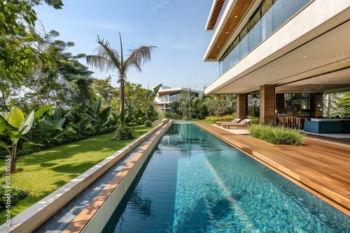 Fototapeta premium : A chic modern villa with a sleek, rectangular swimming pool, bordered by a wooden deck and lush, manicured gardens, captured in high definition.