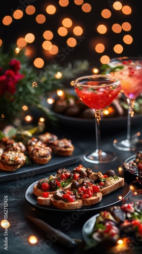 Fototapeta premium A chic table setting featuring elegant appetizers like bruschetta,
