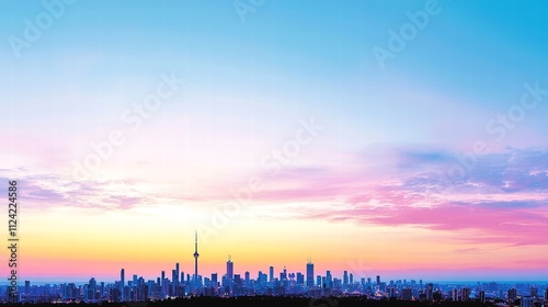 © Preecha, Fototapeta premium A chic urban skyline during twilight, where the silhouettes of buildings are beautifully contrasted against a colorful horizon. The composition highlights the interplay of light and shadow, making it