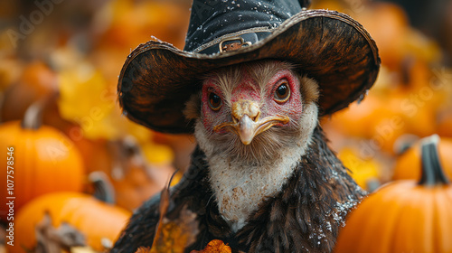Obraz premium A chicken wearing a witch's hat stares intently at the camera, surrounded by pumpkins.