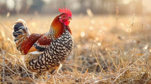 Fototapeta premium A chicken with brown black and white feathers strolling through dry grass on...