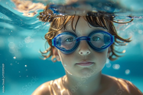 Naklejka premium a child, a boy, swims in the pool wearing goggles for swimming underwater. water treatments, a kind of sport.