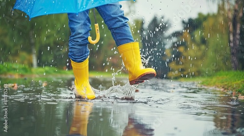 Fototapeta premium a child, adorned in vibrant rain boots, leaps into puddles with an umbrella...